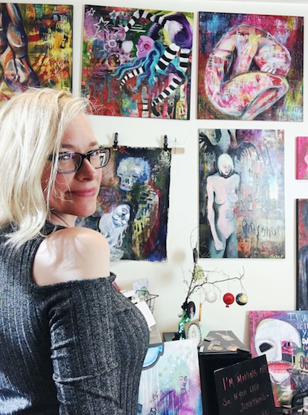 Heather Mellor loves a variety of mediums. To date, the majority of her work has been done in acrylic, though she enjoys sketching, photography, and mixed media work, as well learning about surface design, stop-motion animation, and edible art. At the moment, she is delving into digital art formats to learn how they can work together with her non-digital art. Her style and subjects vary. She likes both things that are cute and playful, as well as exploring darker emotions, the melancholy and the macabre.